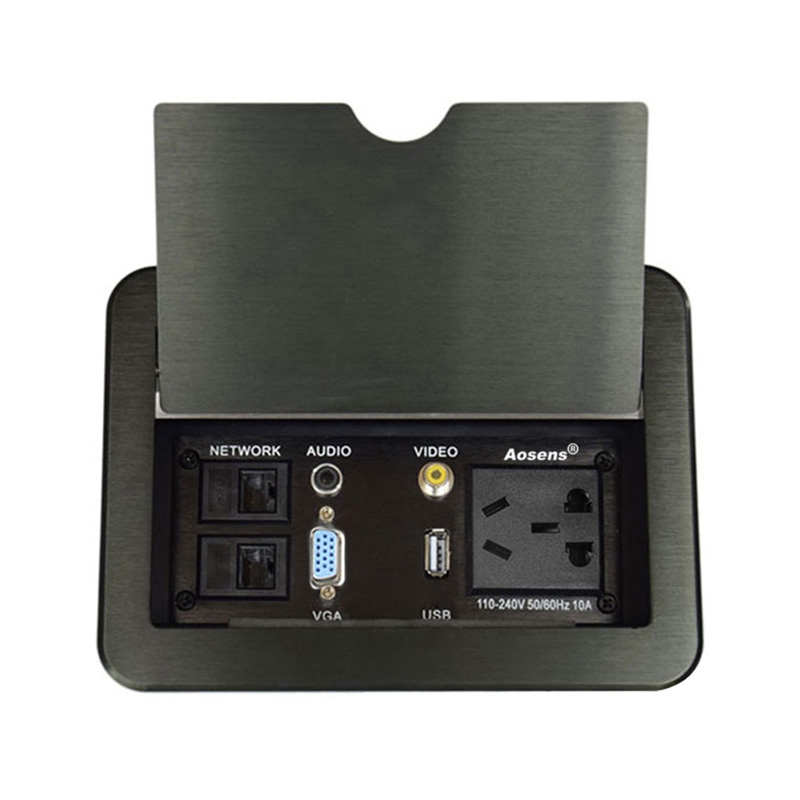 Aosens奥盛 掀盖式铝合金多媒体桌面插座会议桌台插座 五孔电源 VGA USB 3.5音频 网络 视频 AS-ZH-410E