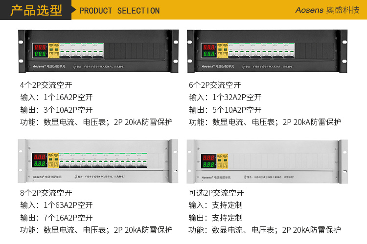 Aosens奥盛 机柜配电单元PDU3U配电箱施耐德交流2P空开电流电压防雷单路