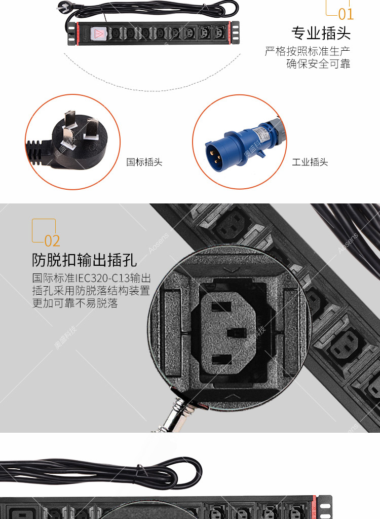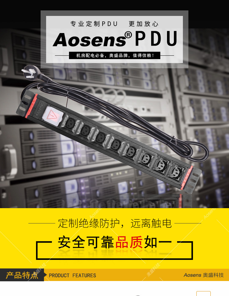 Aosens奥盛 16A16位C13防脱C19插孔2P正泰空开PDU机柜插座AS-1.5UB-C10D6VY