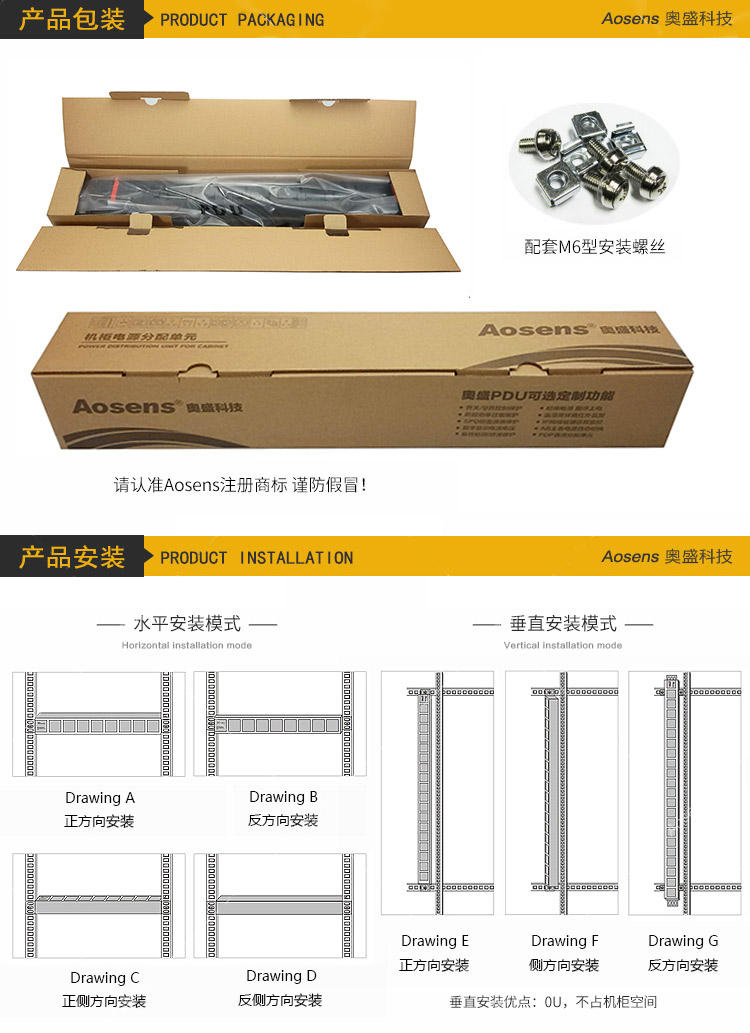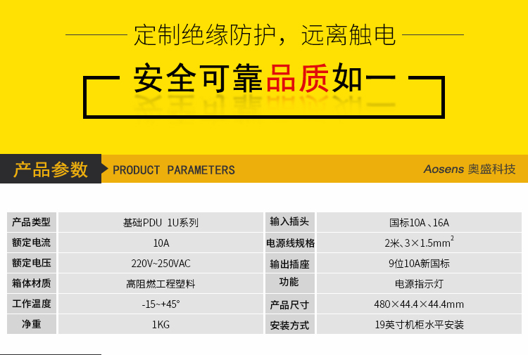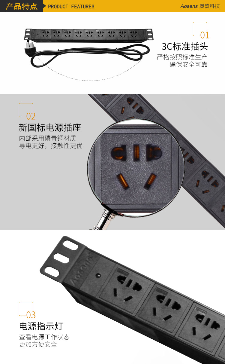 Aosens奥盛10A九联PDU机柜电源插座带指示灯19英寸工程款