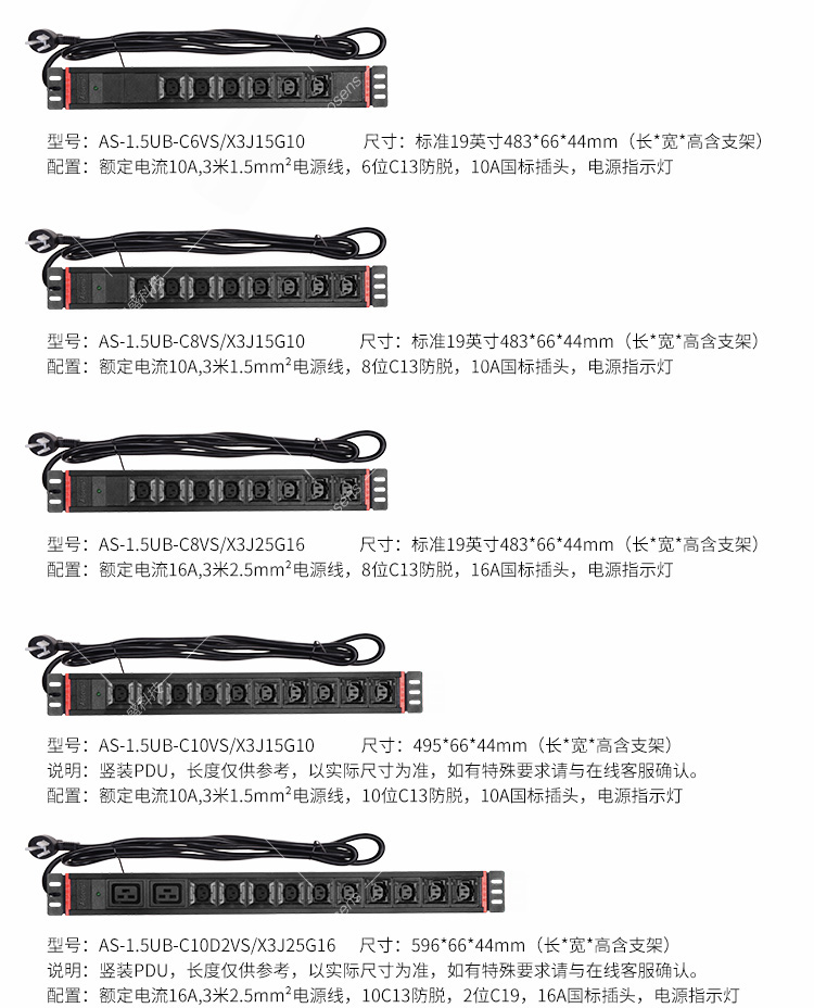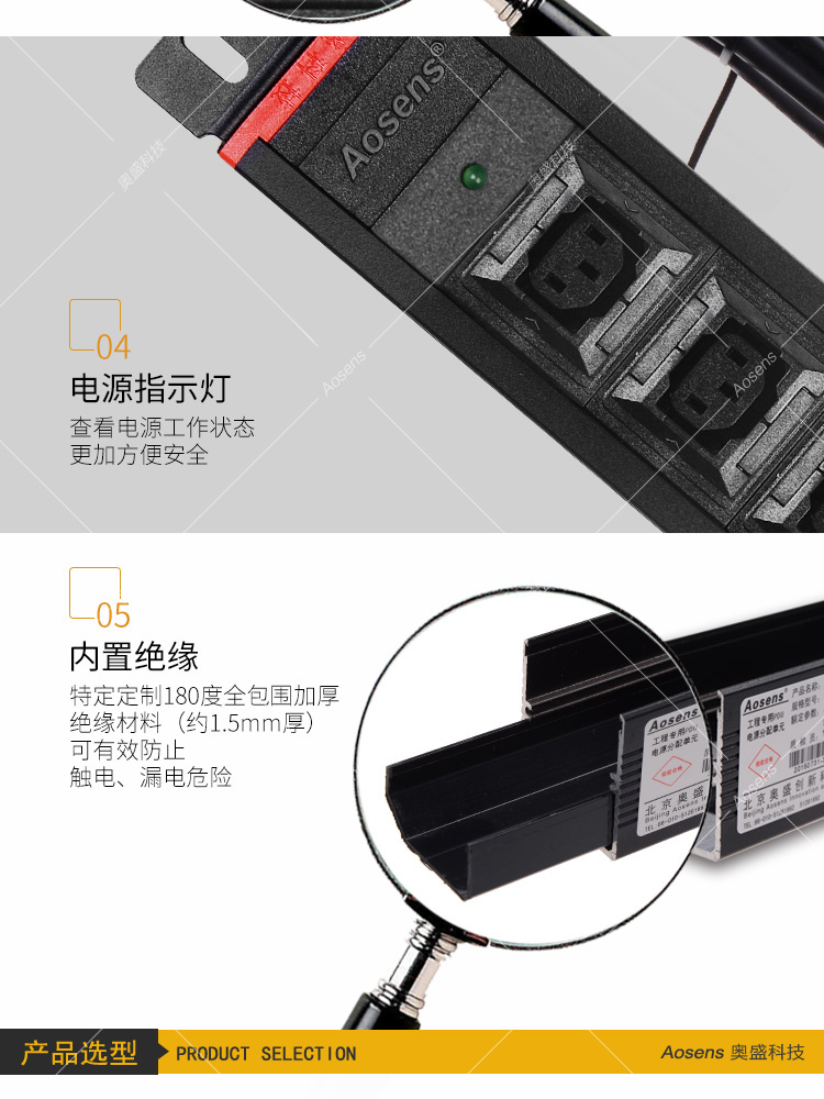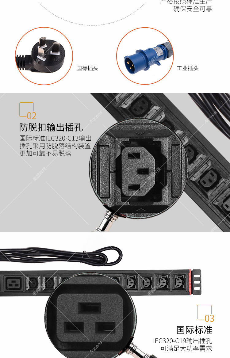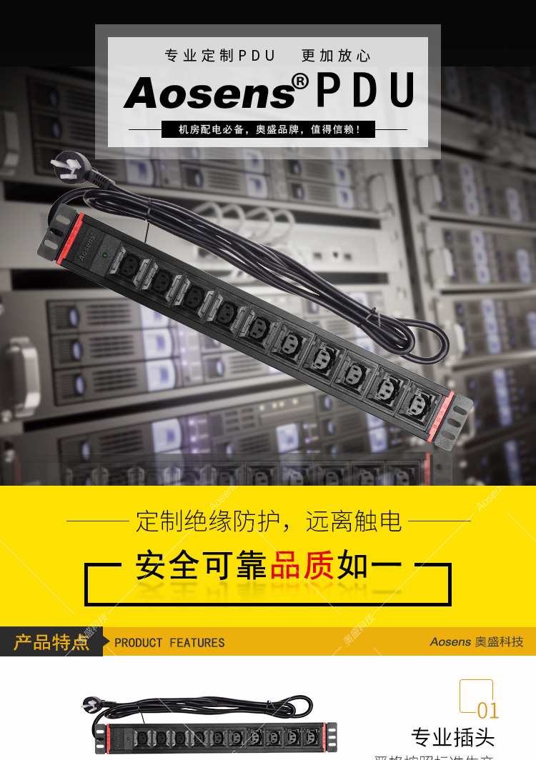 Aosens奥盛 16A24位C13防脱C19插孔PDU机柜电源插座 电源指示定制插座AS-1.5UB-C14D10VS