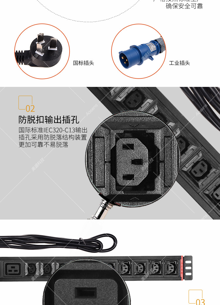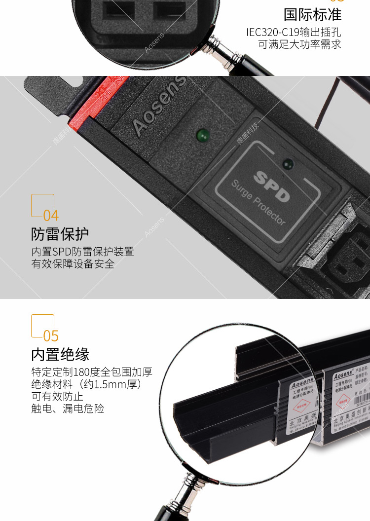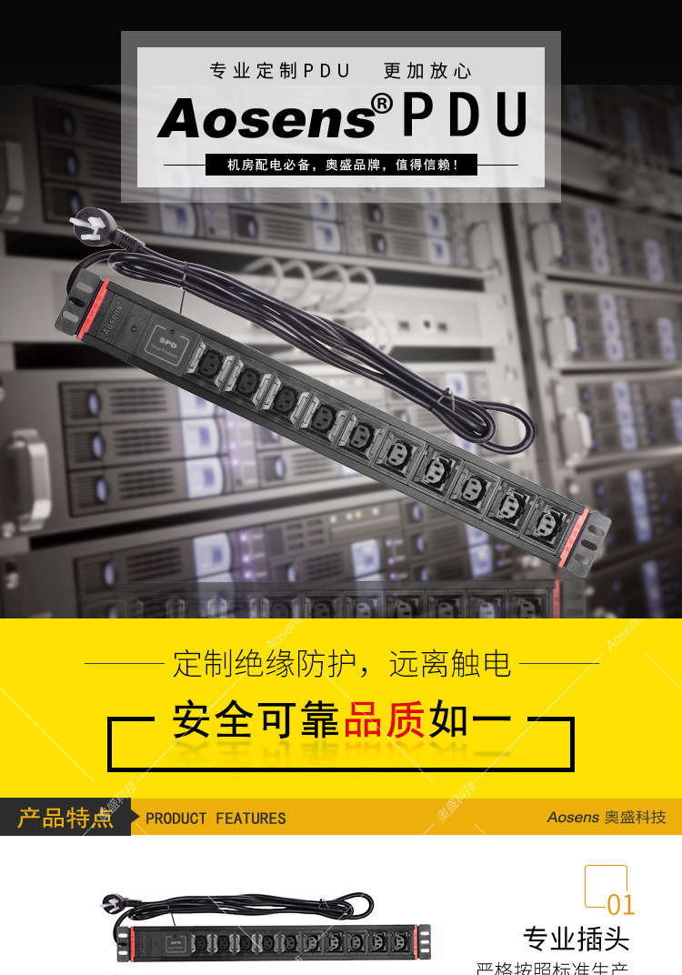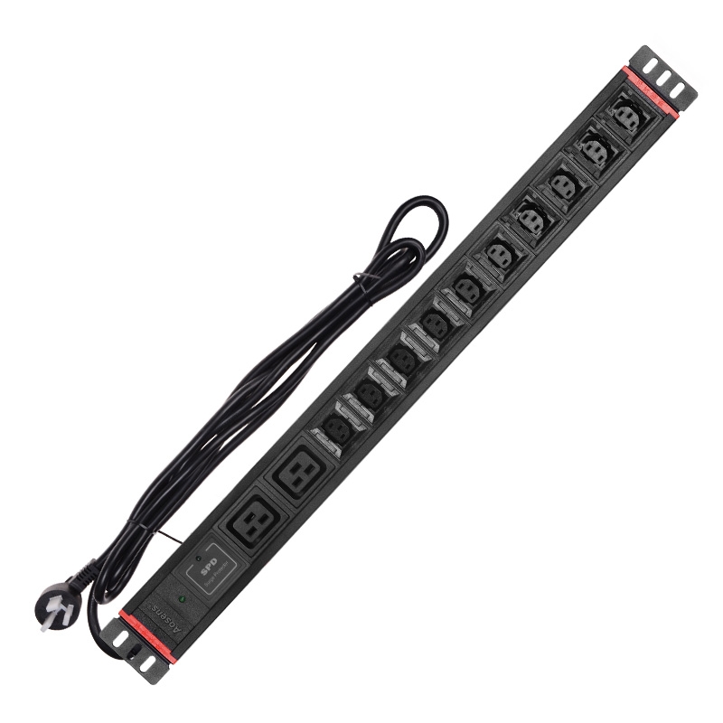 Aosens奥盛 16A12位C13防脱C19插孔PDU机柜电源插座 SPD防雷 电源指示灯AS-1.5UB-C10D2VKS