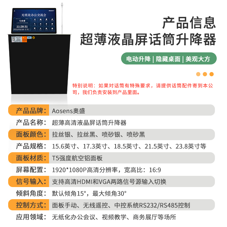 Aosens奥盛 15.6英寸超薄液晶屏升降器带麦克风HDMI高清VGA输入AS-OS156M