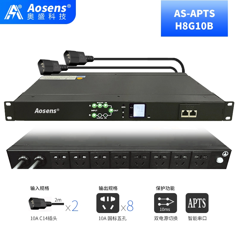 定制10A奥盛(Aosens)STS双电源切换器静态切换开关RS485智能国标五孔2500W电源 AS-APTS