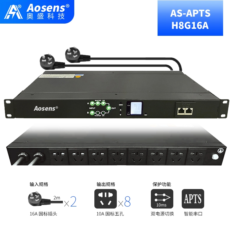 定制16A奥盛(Aosens)STS双电源切换器静态切换开关RS485智能国标五孔4000W电源 AS-APTS