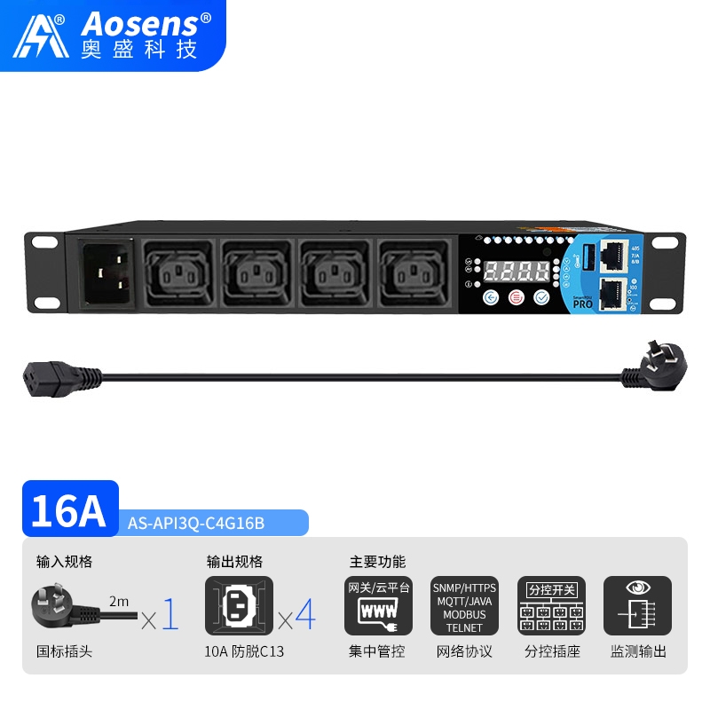 Aosens奥盛10A国标智能PDU四位c13防脱可编程控制SNMP开发云平台集中管理定时IP访问 AS-API3Q-C4G10A