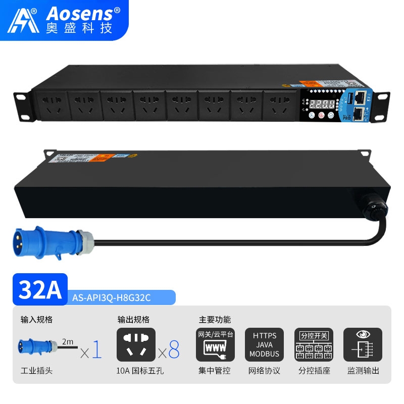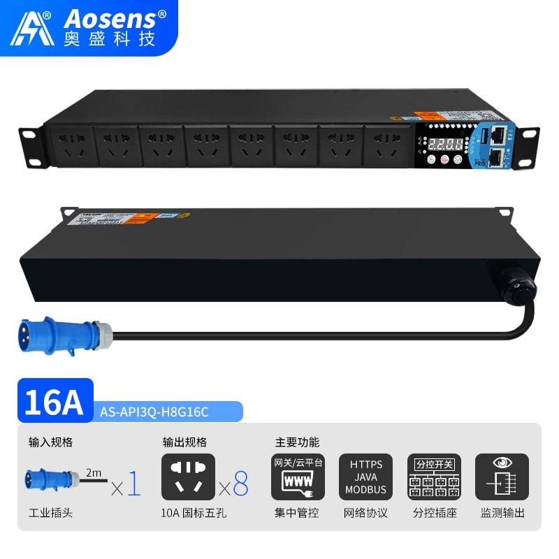 奥盛(Aosens)API3Q网络远程监控五孔PDU电源插座智能时序控制定时物联网SNMP协议MODBUS