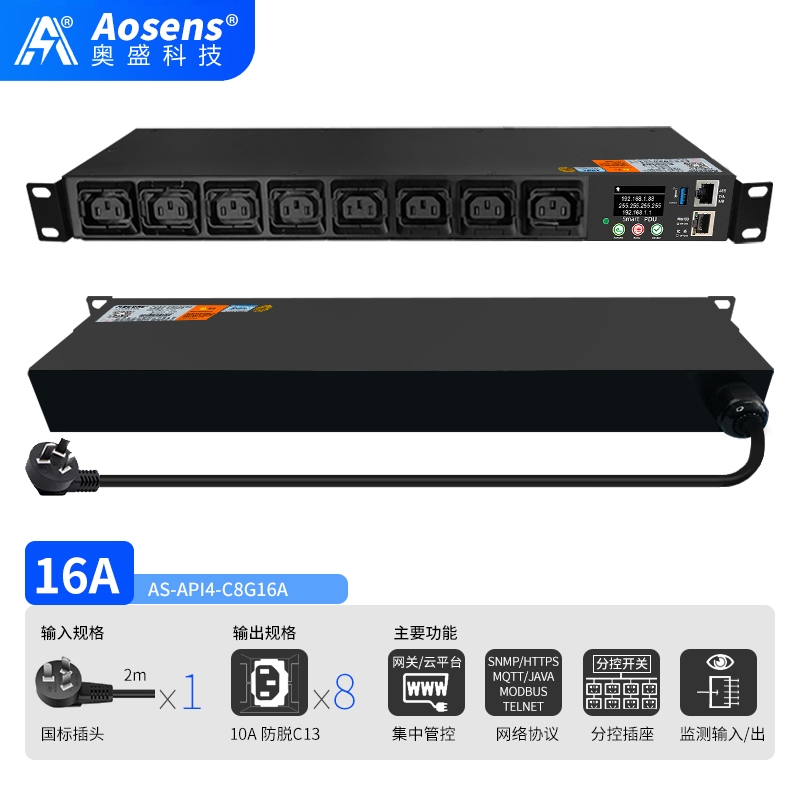 奥盛(Aosens)API4网络远程监控C13防脱PDU电源插座智能时序控制定时物联网SNMP协议MODBUS
