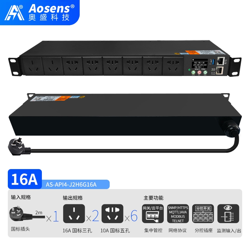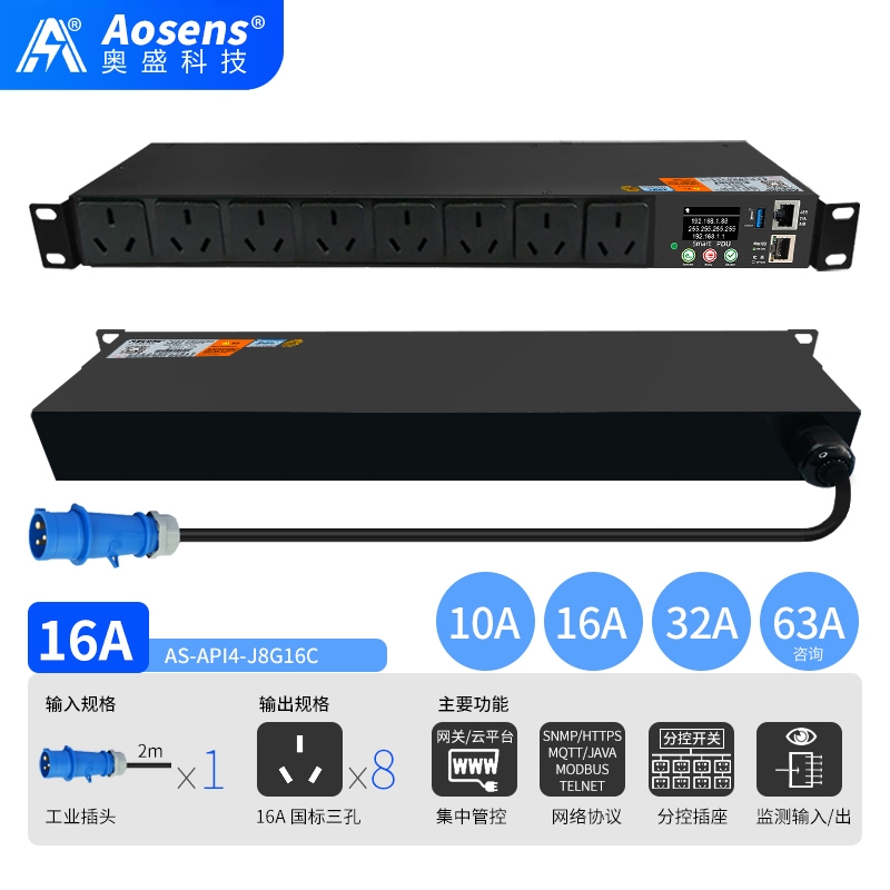 奥盛(Aosens)API4网络远程监控国标三孔PDU电源插座智能时序控制定时物联网SNMP协议MODBUS