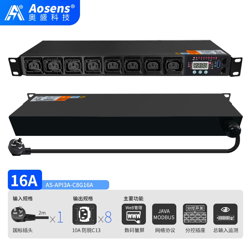 奥盛(Aosens)API3A网络远程监控C13防脱PDU电源插座智能时序控制定时开关HTTP协议MODBUS