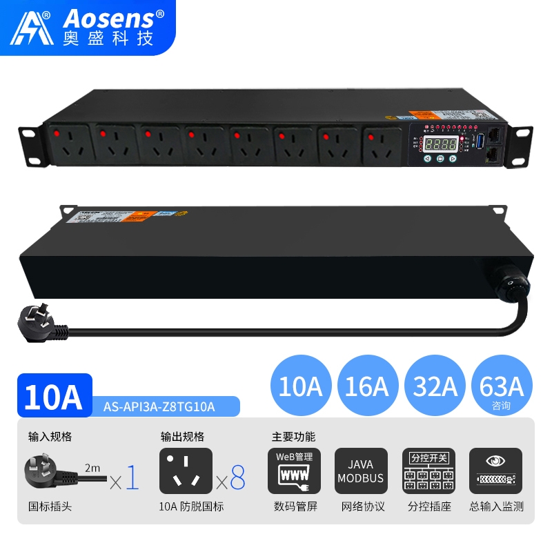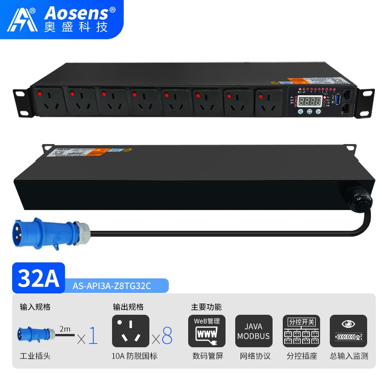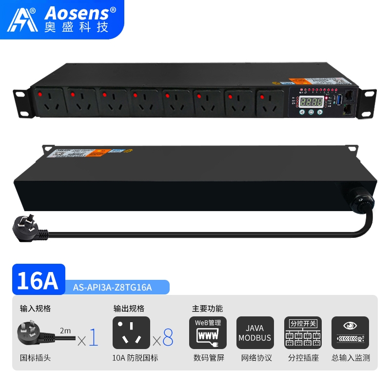 奥盛(Aosens)API3A网络远程监控三孔防脱PDU电源插座智能时序控制定时开关HTTP协议MODBUS