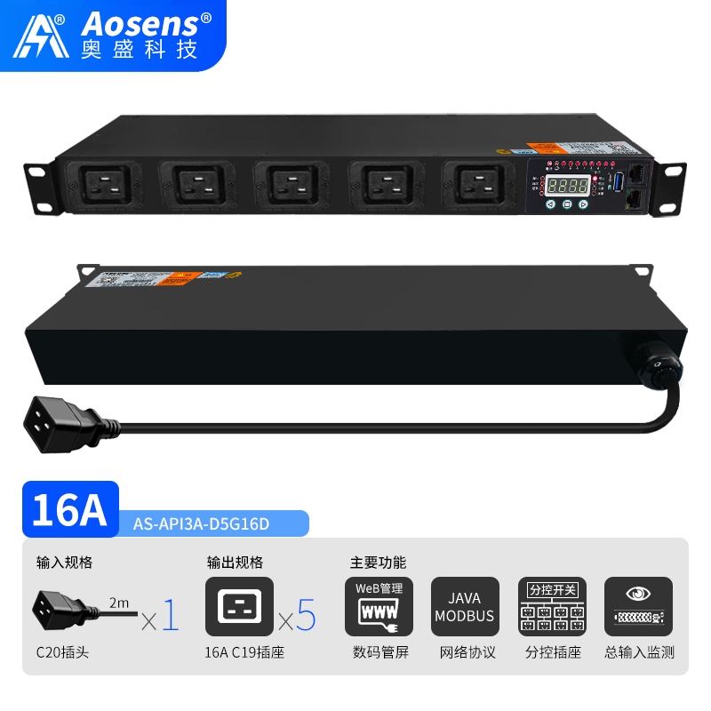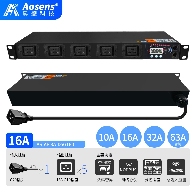 奥盛(Aosens)API3A网络远程监控C19 PDU电源插座美标智能时序控制定时开关HTTP协议MODBUS协