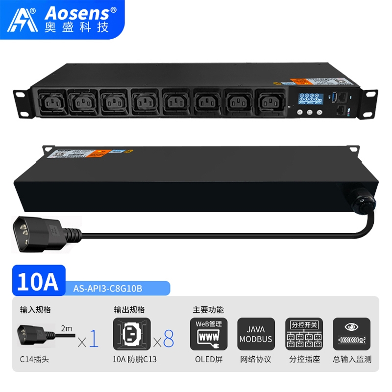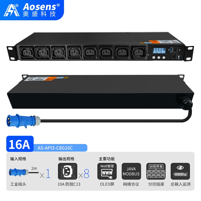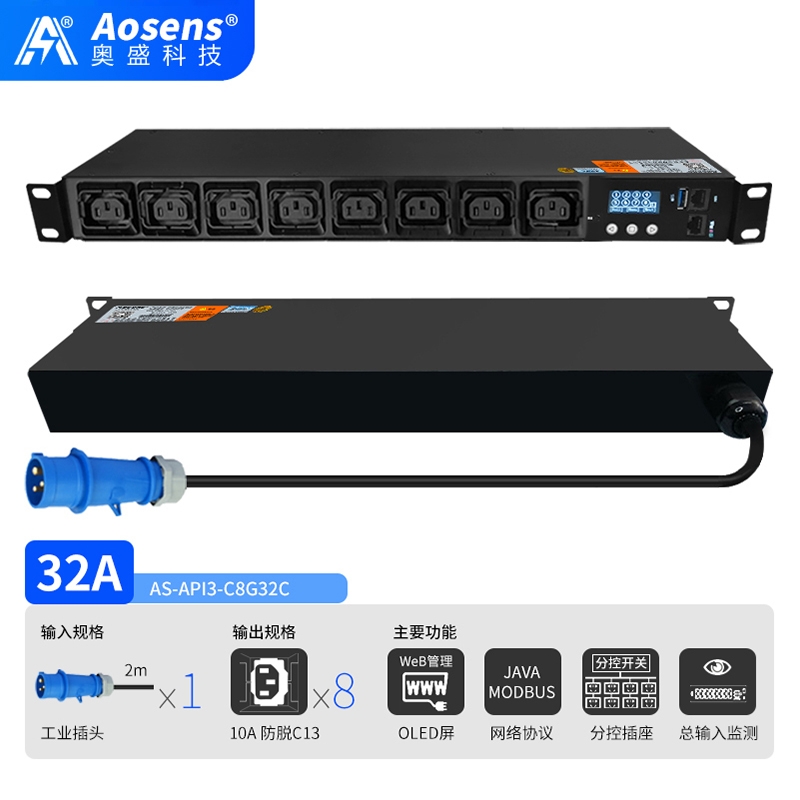 奥盛(Aosens)API3网络远程监控C13防脱PDU电源插座智能时序控制定时开关HTTP协议MODBUS