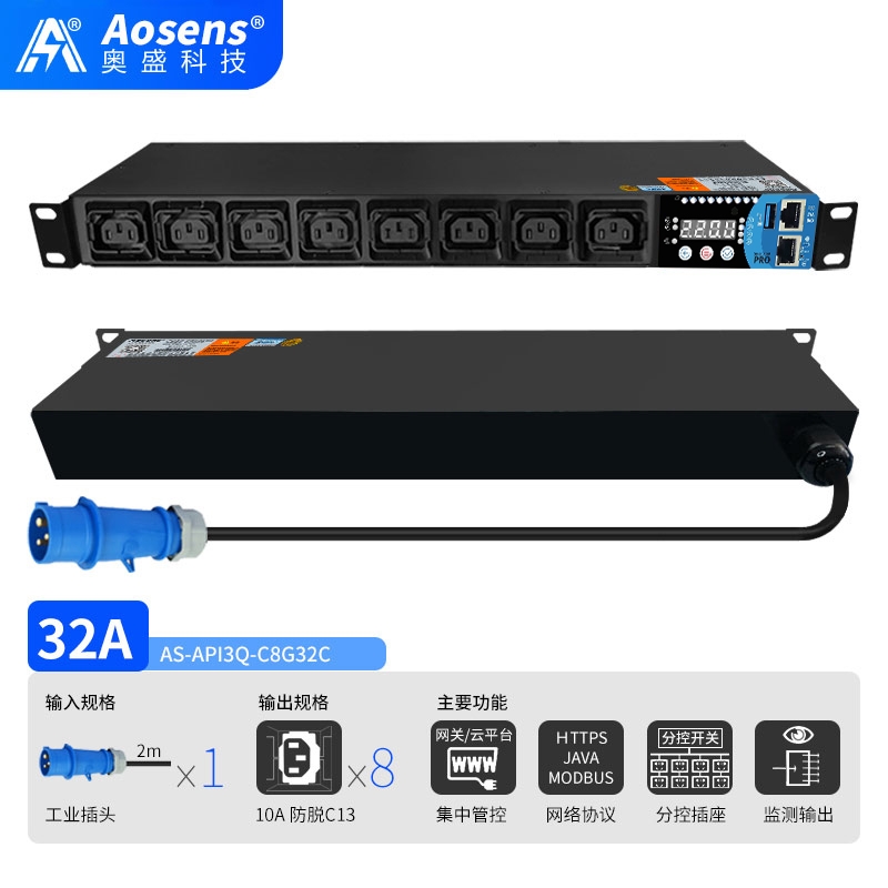 奥盛(Aosens)API3Q网络远程监控C13防脱PDU电源插座智能时序控制定时物联网SNMP协议MODBUS
