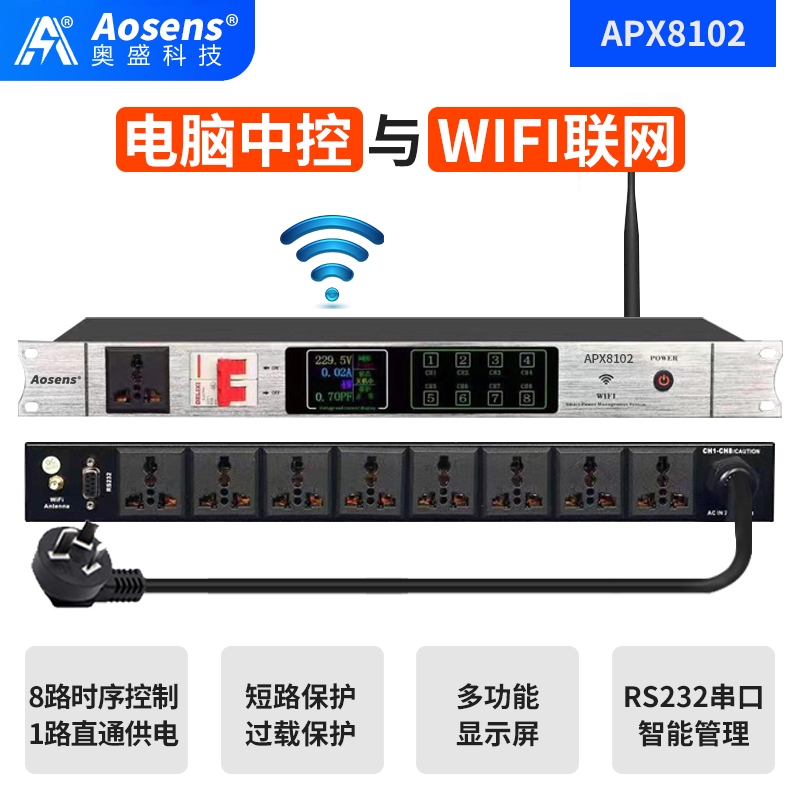 Aosens奥盛 APX8102 WiFi电源时序器动作延时上电KTV舞台会议远程控制器商用定制 9路