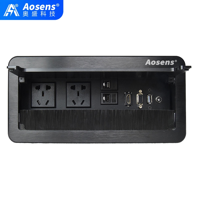 Aosens奥盛毛刷翻盖桌面插座铝合金拉丝面板五孔电源 双网络 USB VGA HDMI AS-ZH-104B