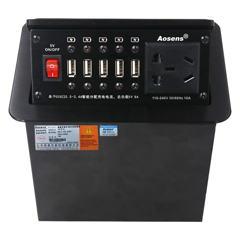 Aosens奥盛 气撑弹起式气压气动多媒体免焊桌面插座 五孔电源 USB开关 5个智能充电USB AS-ZH-307N