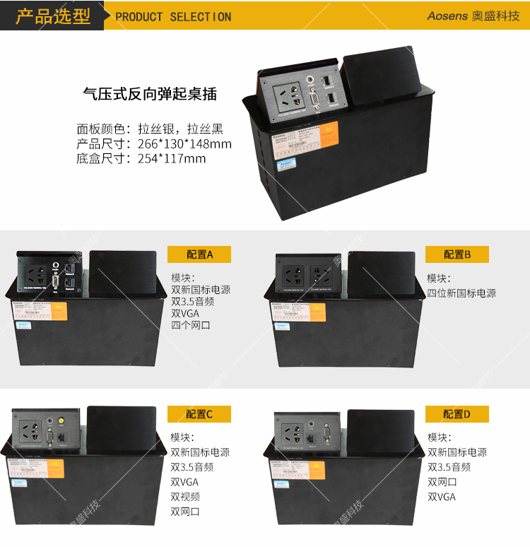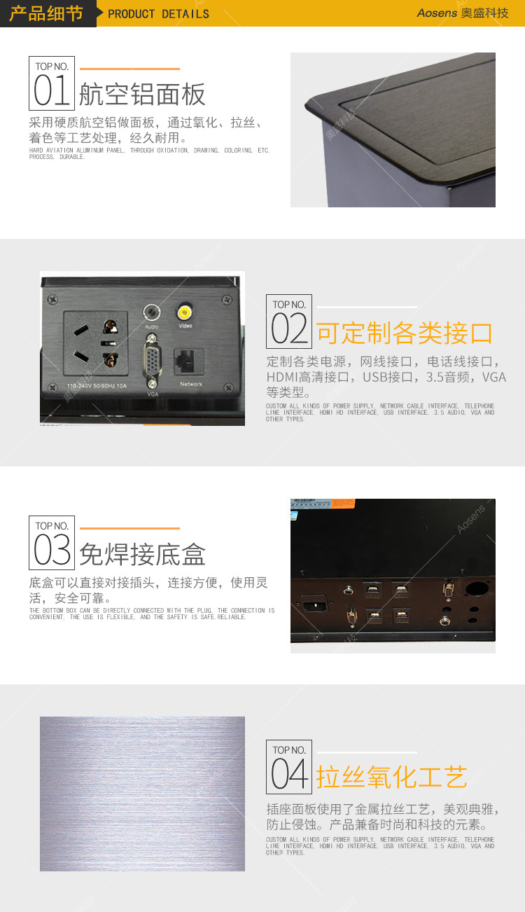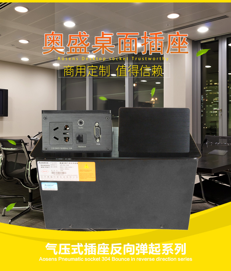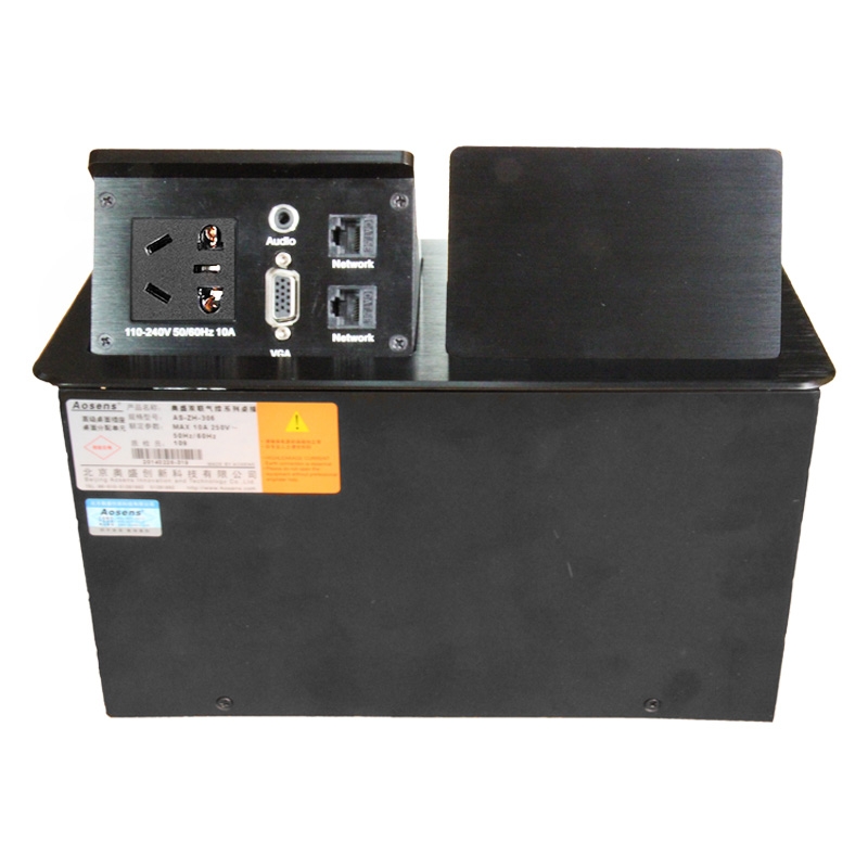 Aosens奥盛 多功能气撑桌面插座 反向弹起多媒体会议桌信息插 五孔电源 3.5音频 双网络 AS-ZH-304A