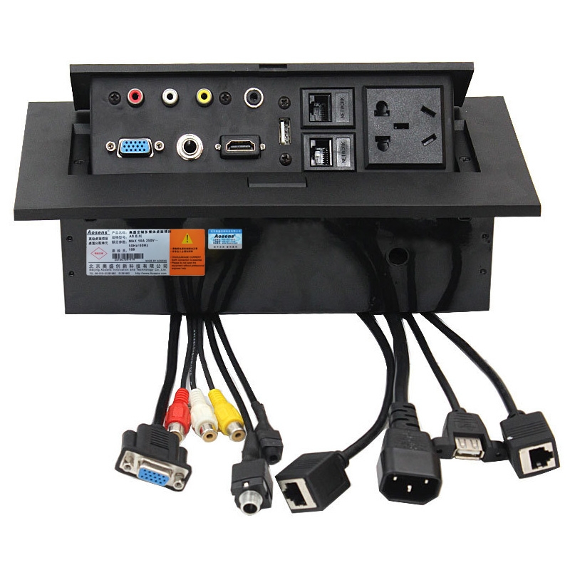 Aosens奥盛 弹起桌插带线信息盒会议桌信息插座五孔电源 音视频 3.5音频 VGA 6.35话筒 HDMI USB 网络AS-ZH-600F